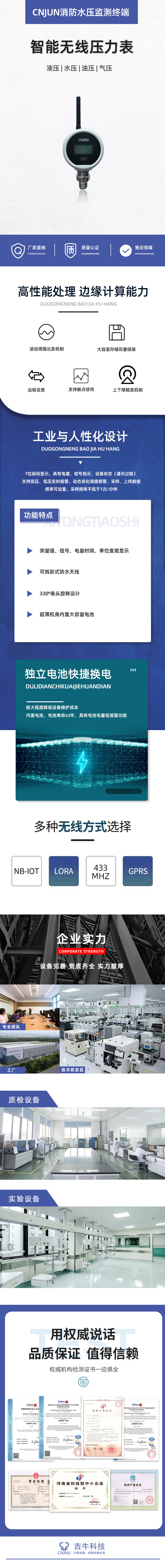 CNJUN消防水压监测终端 智能无线压力表 液压 | 水压 | 油压 | 气压 高性能处理,边缘计算能力。波动阈值出发机制 大容量储存双重保障 远程设置 支持断点续传 上下限触发机制。多种无线方式选择 NB-IOT LORA 433MHZ GPRS。独立电池快捷换电 极大程度降低设备维护成本 内置电池寿命≥3年,具有电池电量低报警功能